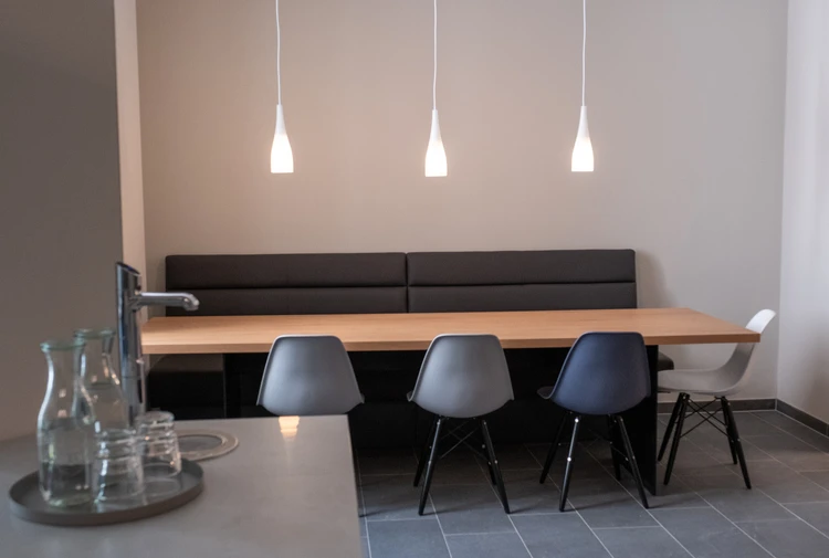 Unsere Klinik verfügt über drei Behandlungsteams, die jeweils einem eigenen Farbkonzept folgen. Jedes Team bietet mit seinen Räumlichkeiten eine eigene Lobby mit offener Küche und einem großen Esstisch, an dem jede und jeder Platz findet. Ein gemütlicher Sitzbereich sorgt für eine wohnliche Atmosphäre. Hier arbeiten, essen und leben wir gemeinsam. Auch finden hier täglich unsere Open-Staff-Sitzungen statt. Auf unseren „Stationen“ gibt es keine Büros. Wir mit Dir!